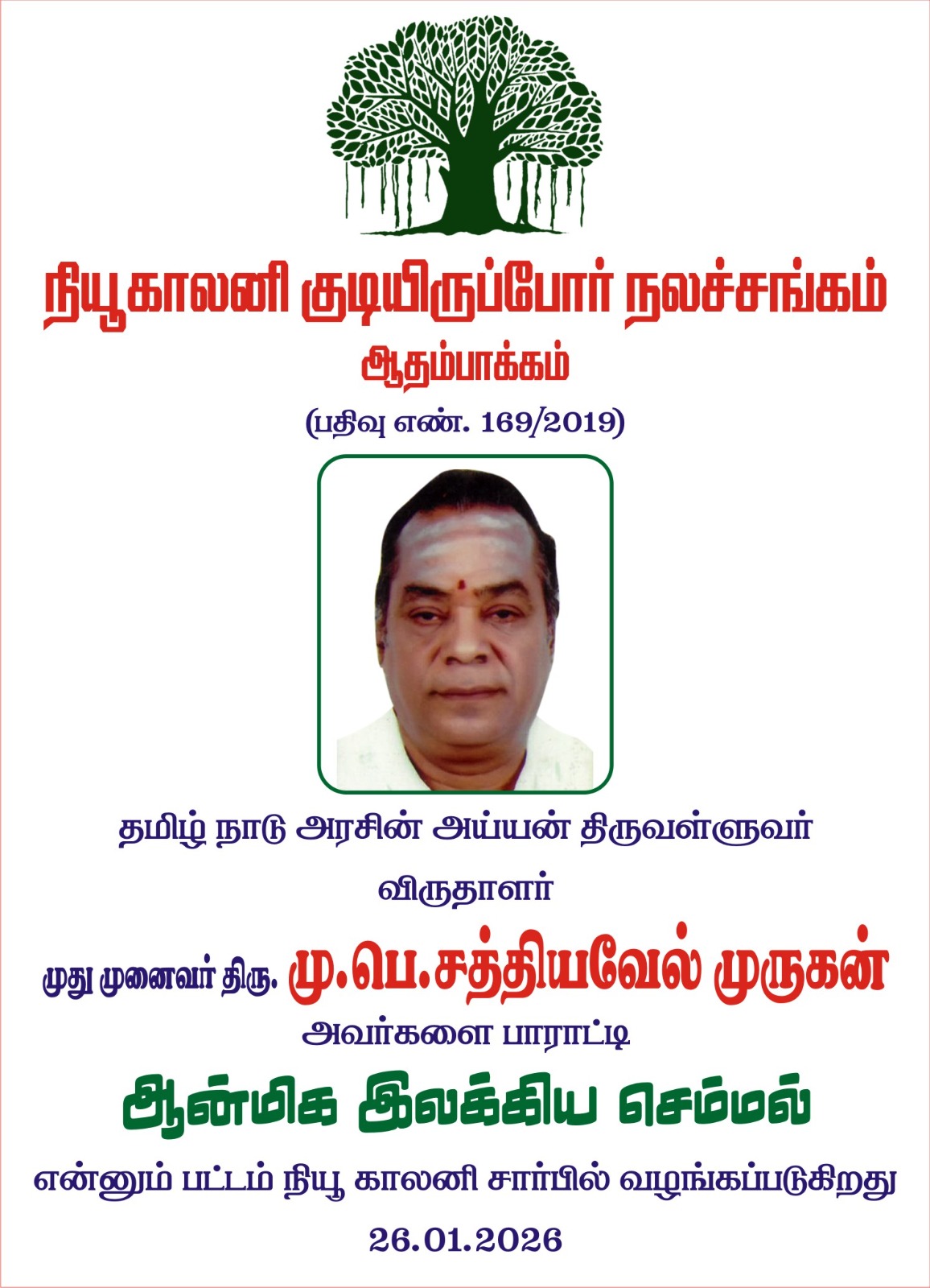 « All Events This event has passed. ஆன்மிக இலக்கிய செம்மல் பட்டம் January 26 @ 8:00 am – 5:00 pm « இர.கணேசன் செங்குந்தர் 95வது பிறந்த நாள் விழா சேக்கிழார் பெருமானின் மாத குருபூசை » https://dheivamurasu.org/wp-content/uploads/2026/01/26-02.mp4 https://dheivamurasu.org/wp-content/uploads/2026/01/26-01.mp4 + Google Calendar+ iCal Export Details Date: January 26 Time: 8:00 am – 5:00 pm