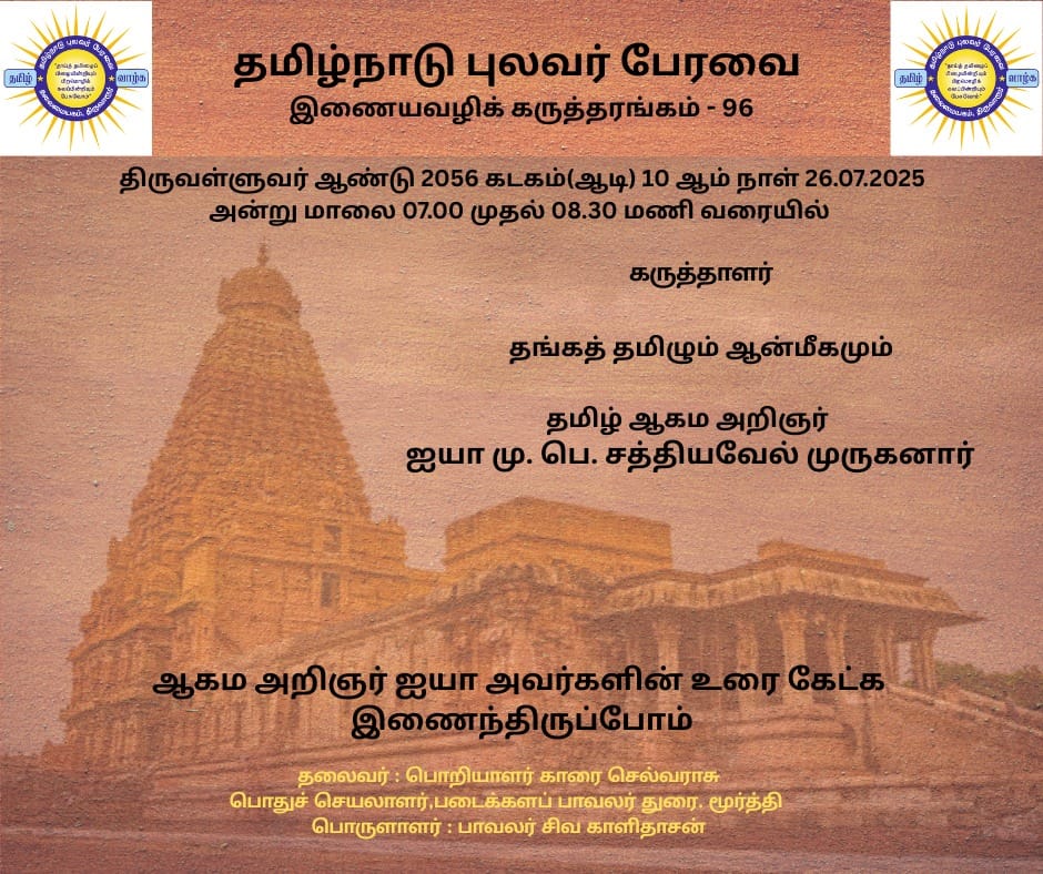 « All Events This event has passed. தங்கத் தமிழும் ஆன்மீகமும் July 26, 2025 @ 7:00 pm – 8:30 pm « சேக்கிழார் குரு பூசை – ஞான வேள்வி (25/07/2025)பூசம் நட்சத்திரத்தில் மாத குருபூசை வழிபாடு . சுந்தரர் விழா அழைப்பிதழ் » + Google Calendar+ iCal Export Details Date: July 26, 2025 Time: 7:00 pm – 8:30 pm