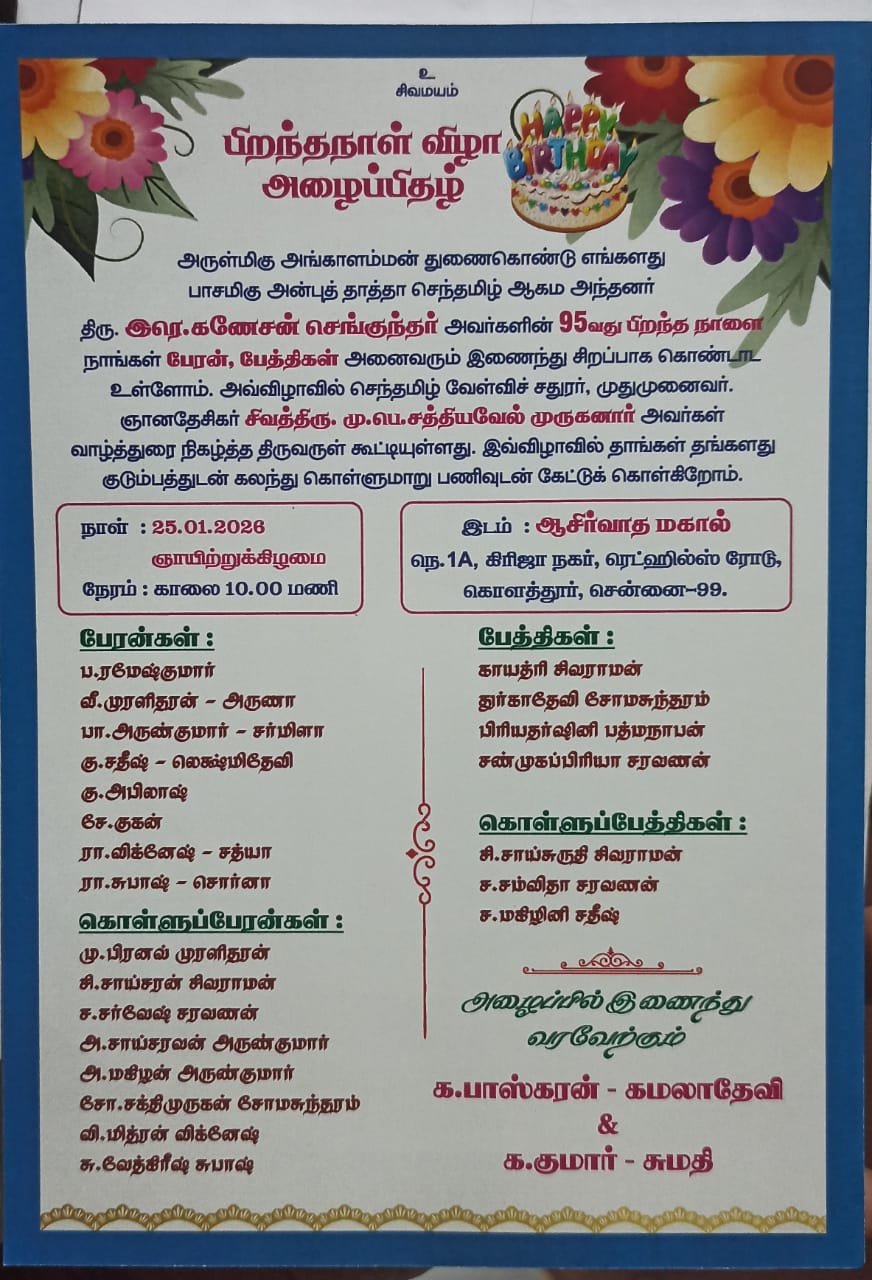 « All Events This event has passed. இர.கணேசன் செங்குந்தர் 95வது பிறந்த நாள் விழா January 25 @ 8:00 am – 5:00 pm « 15ம் ஆண்டு வள்ளிமலை மலைவலம் மற்றும் படிவிழா ஆன்மிக இலக்கிய செம்மல் பட்டம் » + Google Calendar+ iCal Export Details Date: January 25 Time: 8:00 am – 5:00 pm